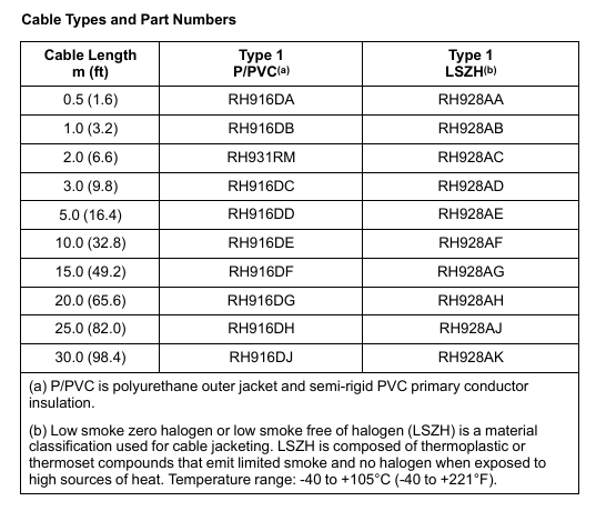 Cables are divided into two categories: “Polyurethane/PVC (Type 1 P/PVC)” and “Low Smoke Zero Halogen (Type 1 LSZH)”. The latter is suitable for scenarios that require smoke toxicity and corrosiveness (such as subways and data centers). The commonly used lengths and part numbers are as follows: