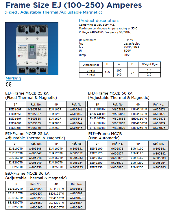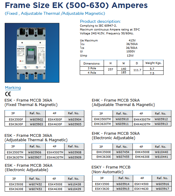 Rated current range 16-800A (subdivided by frame size: EJ: 100-250A; EK:320-630A)