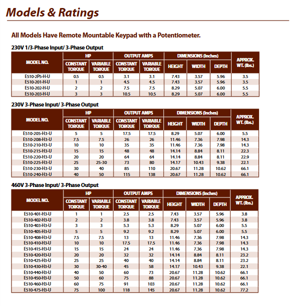 460V 3-phase 1-75HP E510-401-H3-U (1HP), E510-475-H3-U (75HP)