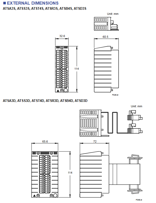 Single channel series ATSA3S, ATSS3S, ATST4S, ATSR3S, ATSB4S, ATSD3S length x width x height: 32.6 x 60.5 x 114 F02E.ai is suitable for control cabinet layouts with limited installation space and no need for redundant design, and can be densely arranged