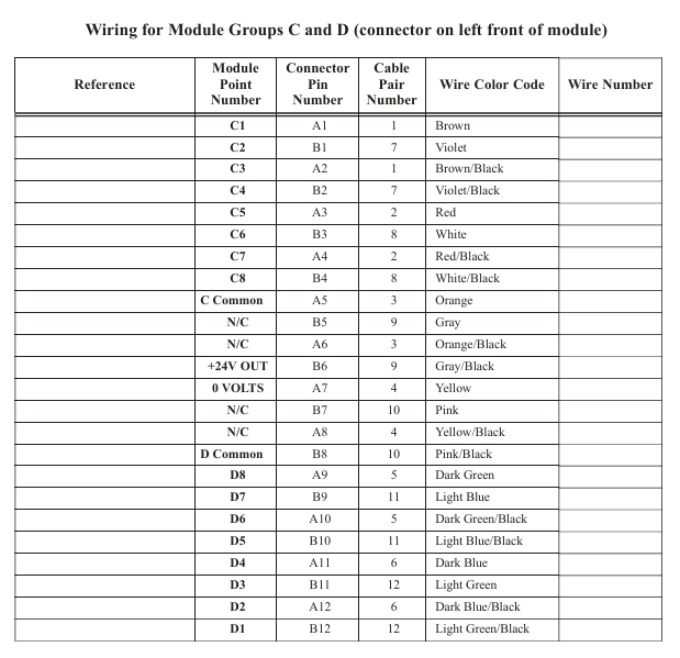 The document provides detailed wiring tables for A/B group (right connector) and C/D group (left connector), specifying module points, connector pins, cable pairs, and color coding. The following are examples of key corresponding relationships: