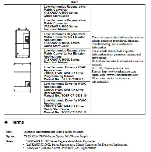 This document is the installation manual for the Yaskawa U1000 series 24V power supply option (model PS-U10L/PS-U10H), which mainly introduces the functions, driver adaptation, installation process, operation verification, and safety specifications of the option. It provides users with full process guidance from receiving inspection to after-sales support, and is suitable for professional installation and maintenance personnel.