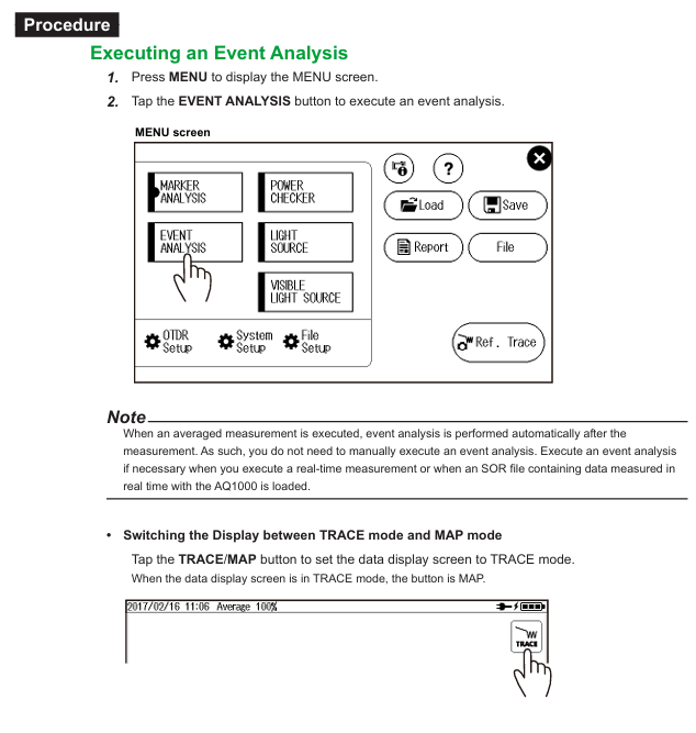 Perform analysis: Press the MENU button and click the EVENT Analysis button. The device will automatically analyze the waveform and display the event (after averaging the measurements, it will be automatically executed without manual operation; when performing real-time measurements or loading real-time measurement SOR files, manual execution is required).