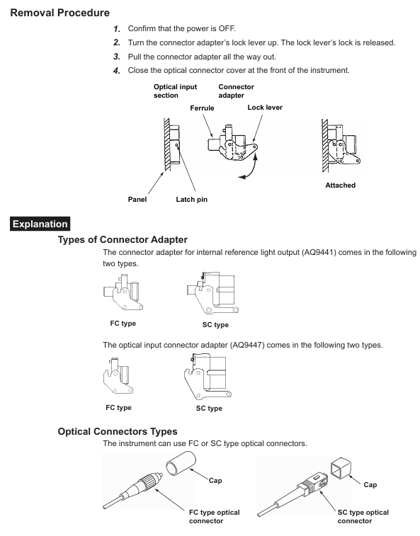 Connector adapter: such as AQ9441 (for FP-LD module), AQ9335C (for sensor module), align the guide pin/hole connection according to the manual steps, and lock the lever