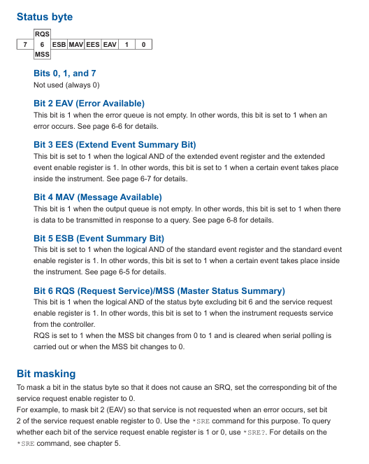 Status report: includes status bytes, standard event registers, extended event registers, and error queues, supported through: Status: ERRor? Query error codes and messages through * STB? Query status bytes to help locate communication or operational anomalies.