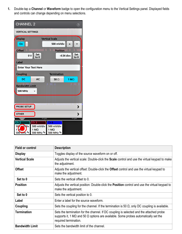 Core functions: Adjust the vertical position and scaling of waveforms, set signal coupling and bandwidth.