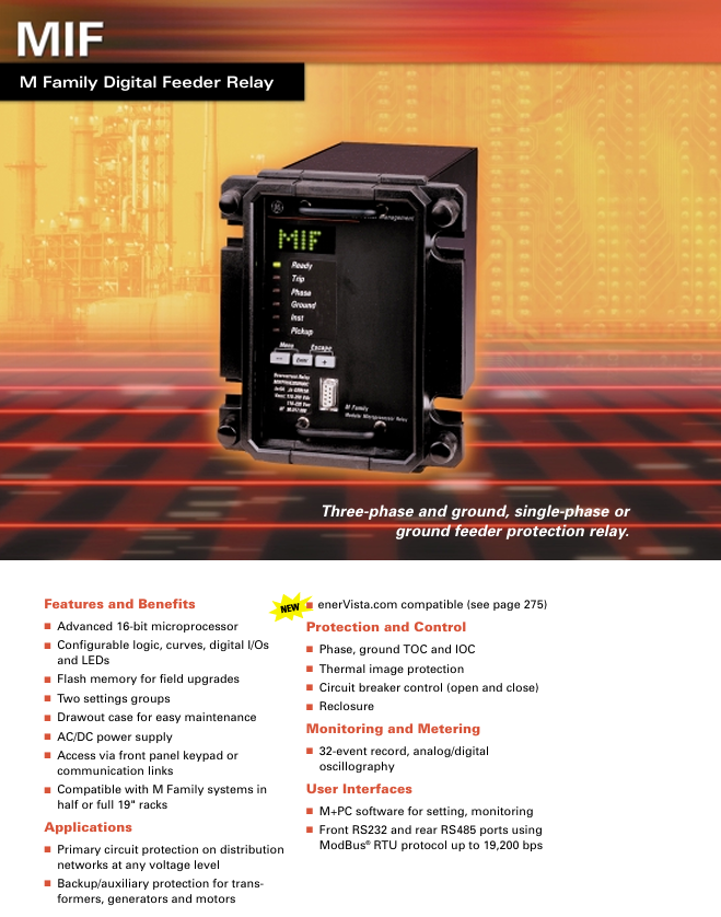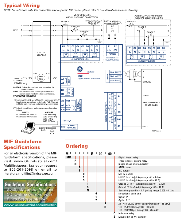 MIF P A 1 1 2 110: Three phase+grounding relay (P), ANSI curve (A), phase CT I n=1A (1), grounding CT I n=1A (1), including option 2 function (2), 110-250V DC power supply (110).