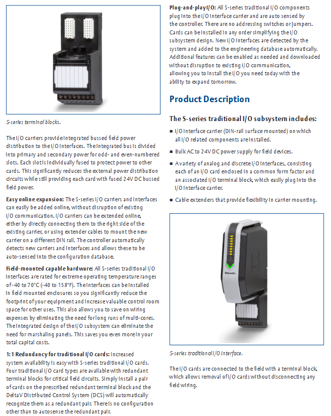 Diagnosis and status indication: Each module is equipped with LED status indicator lights (such as “power normal”, “signal normal”, “fault alarm”), which can intuitively judge the operating status of the module; Simultaneously supporting “remote diagnosis”, monitoring the real-time status of modules (such as channel faults and overloads) through the DeltaV/Ovation system, and generating diagnostic reports.
