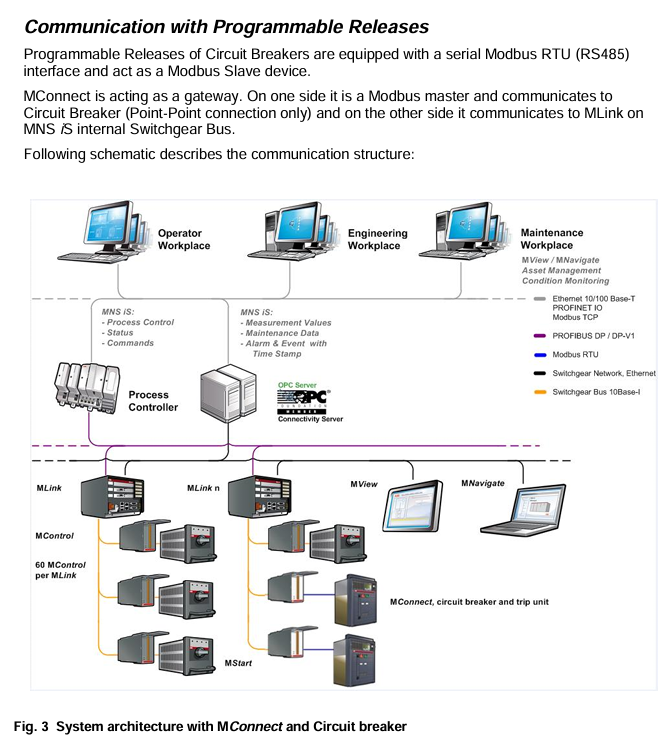 Communication role: MConnect serves as the Modbus RTU master and communicates point-to-point with the programmable release of the circuit breaker (Modbus slave) through RS485; At the same time, as a gateway, it communicates with MLink through the internal “Switchgear Bus” (10Base-T Ethernet) of MNS iS.
