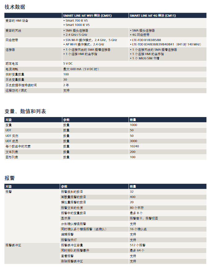 The SIEMENS SMART LINE V5 series (including SMART 700 IE V5/1000 IE V5) is a new generation of exciting HMI panels compatible with S7-200 SMART PLC. It is equipped with an ARM dual core 1.2GHz CPU, supports 7/10.1 inch widescreen display, adds RS232 interface and SD card slot, and extends RTC power-off retention to 3 years. It is compatible with V4 hole size without changing the cabinet; Scalable 4G/WIFI IoT module, enabling VPN remote access and data maintenance through Siemens SIMICAS cloud platform, supporting JavaScript scripts, UDT custom data types, and encrypted communication, providing flexible and efficient small-scale automation solutions.
